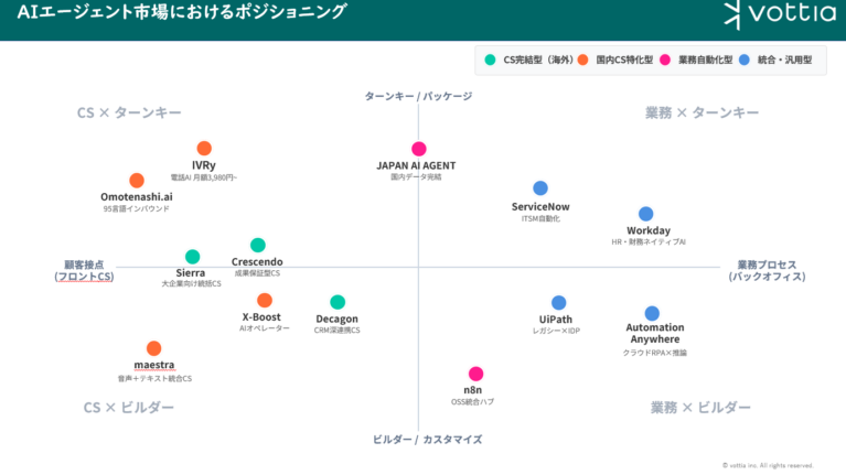 「音声対応が必須か」「既存システムとの連携範囲」「日本語対応の充実度」といった観点で、カテゴリごとの強みが決まっています。なお、マップにはvottia提供の「maestra」も参考としてプロットしています。